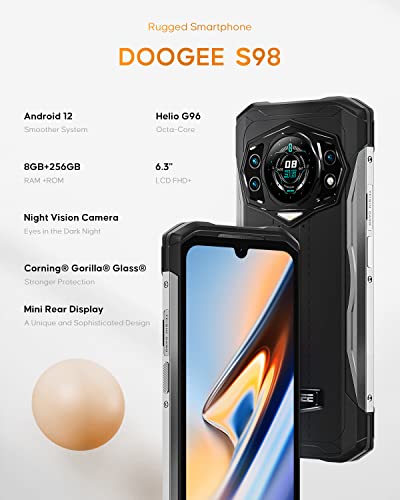 The Doogee S98 is a MIL-STD-810G rated, IP68/IP69K-certified rugged phone featuring a unique 1.1-inch rear circular display for notifications and media control. Powered by a MediaTek Helio G96 processor, 8GB RAM, and 256GB storage, it offers a 6.3-inch FHD+ display, a 64MP main camera, and a specialized 20MP infrared night vision camera. The device boasts strong battery life with a...Leer más